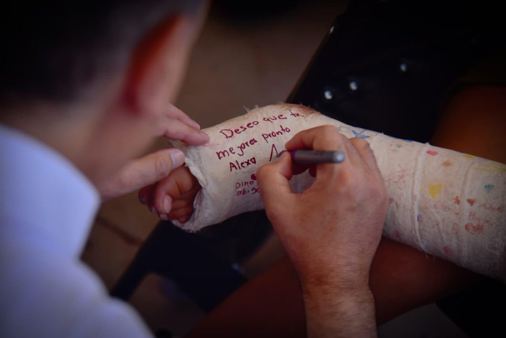 Al final del evento, el Alcalde saludó y atendió a los asistentes que le solicitaron su ayuda, y entregó una silla de ruedas a la niña Alexa Abigail, a quien incluso le dejó un mensaje en el yeso de su pierna.