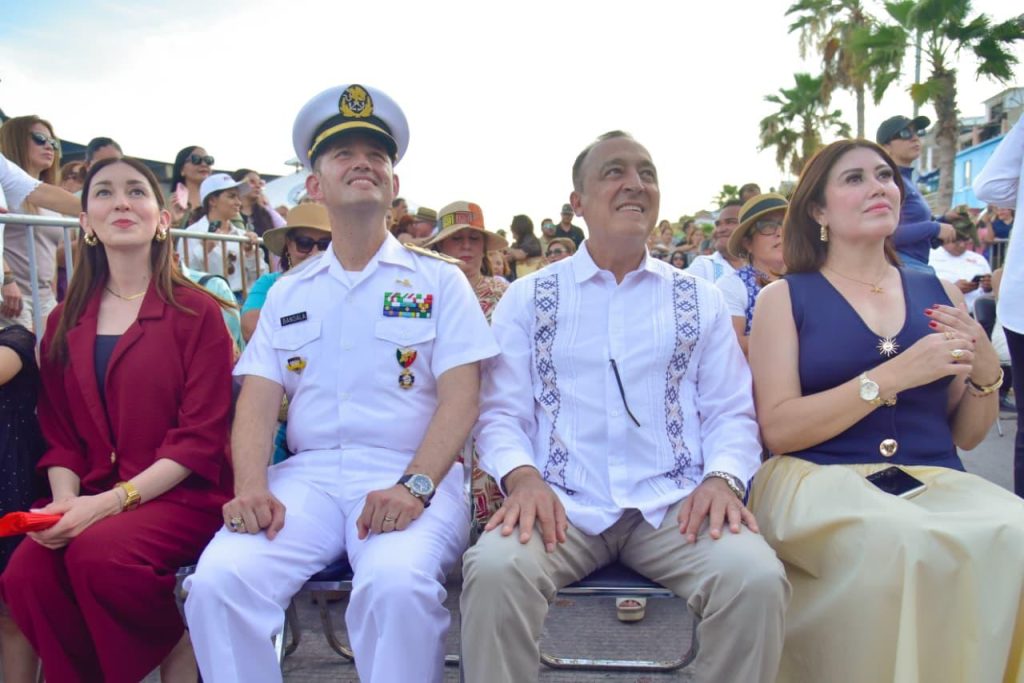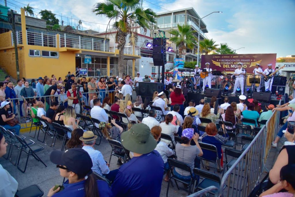 Puerto de Topolobampo, Ahome, Sinaloa. A 14 de Abril de 2026.- Después de la recreación del primer combate aeronaval del mundo en la bahía de Topolobampo este martes 14 de abril, 112 años después del suceso que coloca a Ahome, La Casa de Todos, en el plano internacional, los cientos de asistentes, entre ellos el alcalde Antonio Menéndez De Llano Bermúdez y la Secretaria de Pesca y Acuacultura del Estado de Sinaloa, Flor Emilia Guerra Mena, y el Vicealmirante de la Octava Zona Naval, Saúl Bandala Garza, recorrieron el malecón y se dirigieron al escenario musical donde las agrupaciones “La Flotilla del Ritmo” y “Grupo Armada” deleitaron a los asistentes a quienes pusieron a bailar y cantar.