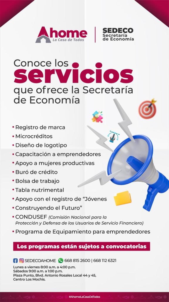 Los Mochis, Ahome, Sinaloa. A 17 de Abril de 2026.- La Secretaría de Desarrollo Económico (SEDECO) del Municipio de Ahome, invita a los interesados en emprender o crecer algún negocio a que se acerquen a sus oficinas para aprovechar los diversos servicios, programas y ventanillas que tiene a disposición de manera permanente.